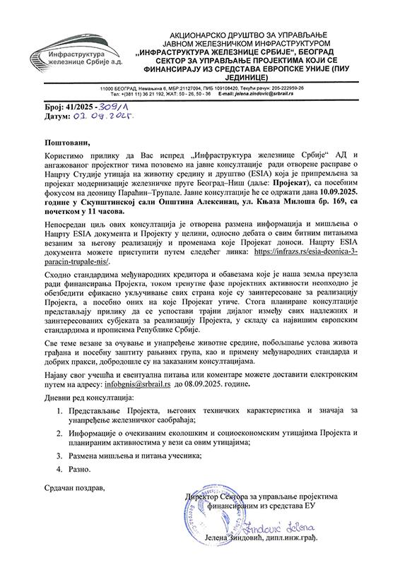 У позивном писму још и стоји да најаву свог учешћа и евентуална питања и коментари могу да се доставе електронским путем још данас на адресу infobgnis@srbrail.rs Нацрт Стратегије може се погледати на линку https://infrazs.rs/esia-deonica-3-paracin-trupale-nis/.