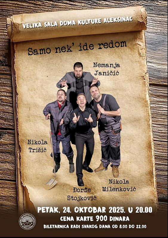 Претпоследње недеље октобра на програму Центра за културу и уметност Алексинац наћи ће се урнебесна траги-комедија „Само нек’ иде редом”, која приповеда о родбинским несугласицама, мукама и похлепи. Комични двојац „Крушевац гета” Чами и Триша одиграће своју нову представу 24. октобра у Великој сали Дома културе.