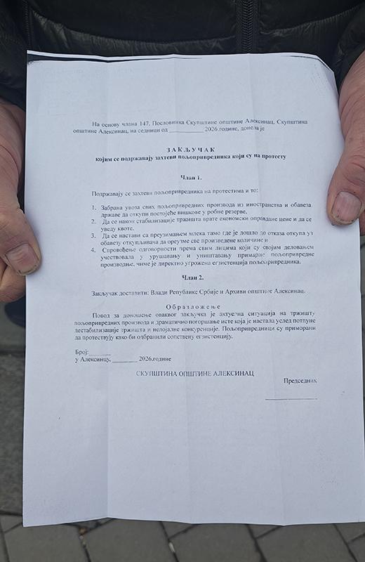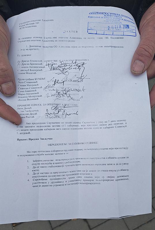 Опозициони одборници у Скупштини општине Алексинац су данас затражили сазивање седнице општинског парламента са предлогом да се донесе Закључак којим се подржавају захтеви пољопривредника који су на протесту. Захтев за сазивање седнице Скупштине општине је потписало 15 одборника из опозиционих одборничких група „Др Драган Бранковић ‒ Поштење је најбоља политика”, Група грађана „Буђење” и „Промене одмах – за општину Алексинац”.