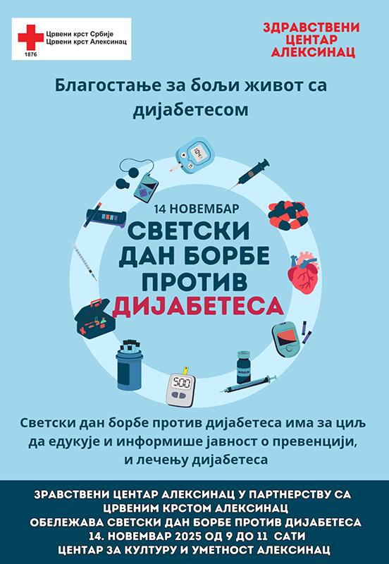 У просторијама Дома културе, а у организацији Дома Здравља и Црвеног крста у Алексинцу, од 9 до 11 часова, грађани ће моћи да провере ниво шећера у крви, крвни притисак и да разговарају са доктором о значају здравих животних навика које смањују ризик од настанка дијабетеса и обаве брз, превентивни преглед.
