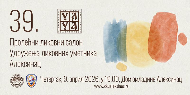 У Дому омладине ће свечано бити отворен 39. Пролећни ликовни салон Удружења ликовних уметника Алексинац (УЛУА). На овогодишњем салону своје радове представиће локални аутори, а поставку ће чинити уметнички радови у различитим техникама. Отварање изложбе заказано је за 19 часова.